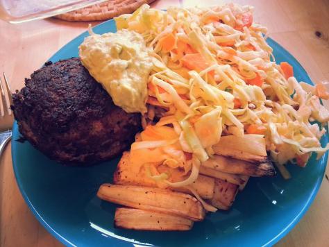 recept vonden op thehealthyfoodie.com, liep het water ons de mond binnen. We hebben de burger wel iets vereenvoudigd, vooral op kruidengebied. Gewoon, omdat wij niet altijd alles in huis hebben en sommige dingen niet in Nederland te koop zijn. Dit recept gebruikt paleo mayonaise… dat is zelfgemaakte mayo, niet die uit de winkel. Dat zit vol conserveringsmiddelen, bindmiddelen en suiker.
