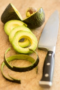 1 hele grote of 2 kleinere avocado’s, haaks op de pit doorgesneden zodat je een plakje krijg met een gat erin